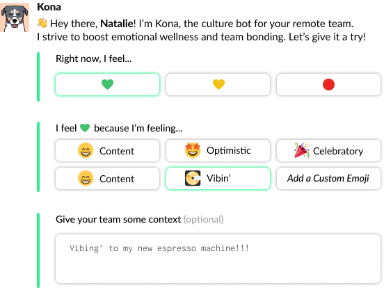 Take a moment to be mindful of your inner wellness, spark it up with a custom emoji and share your mental state with your teammates.