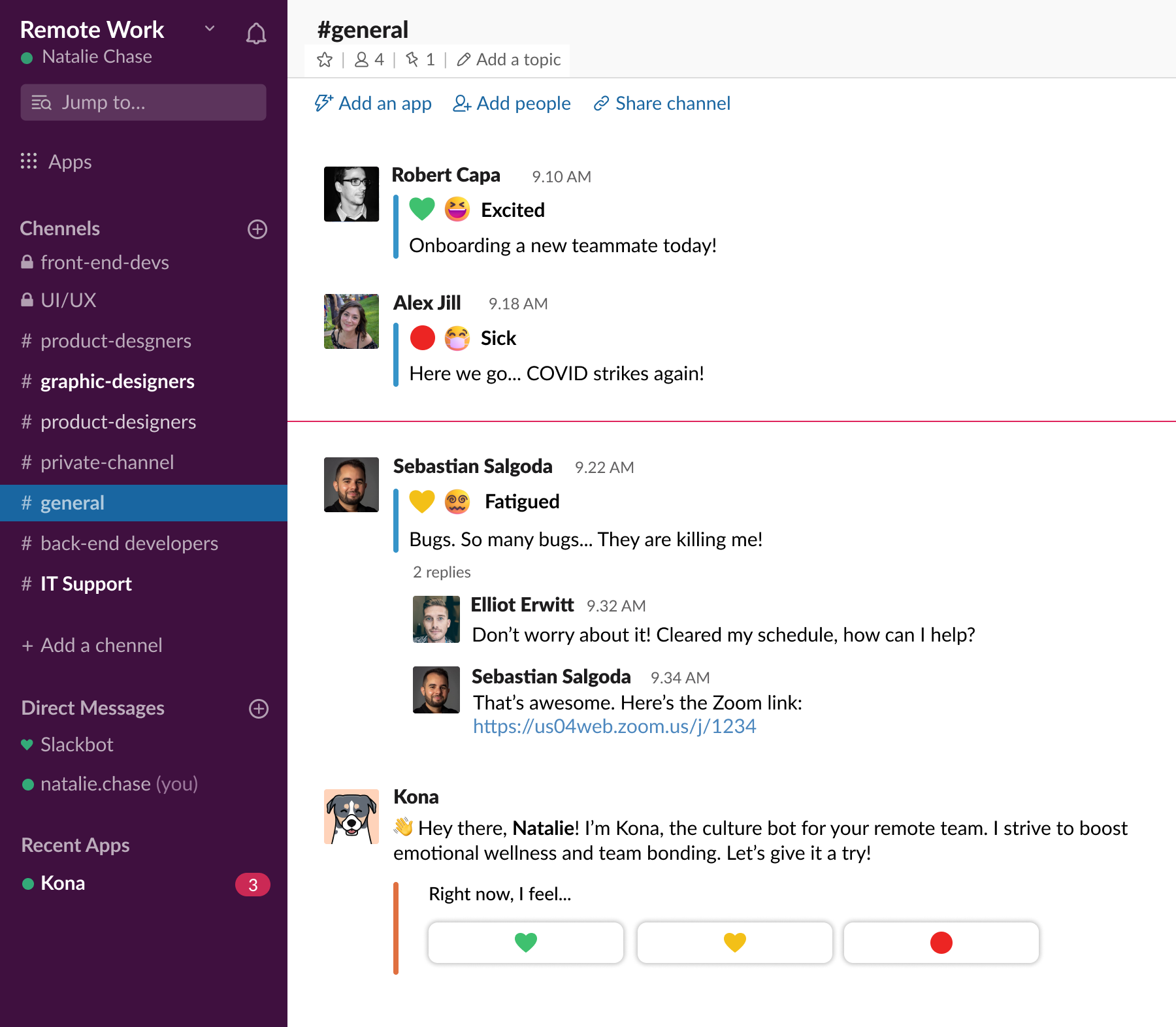 Built for remote team of any size and any field across the world. Kona Pro & Kona Enterprise plans help nurture your team's mental health with upgraded security, dedicated account support, and unique additional features.